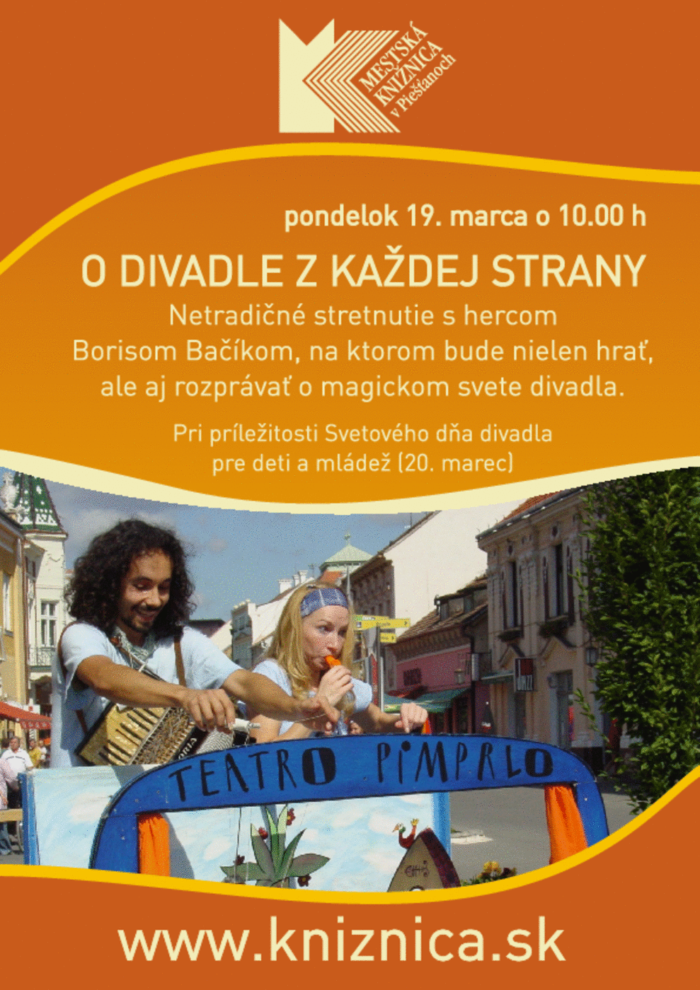 Pri príležitosti Svetového dňa divadla do knižnice zavítal bábkoherec Boris Bačík, ktorý deťom porozprával o tom ako vzniká divadlo a divadelné postavičky. Svoje vystúpenie doplnil o ukážky z bábkových predstavení. Na divadelnom podujatí sa zúčastnili deti z MŠ Valová, ZŠ M.R.Štefánika a ZŠ Holubyho.