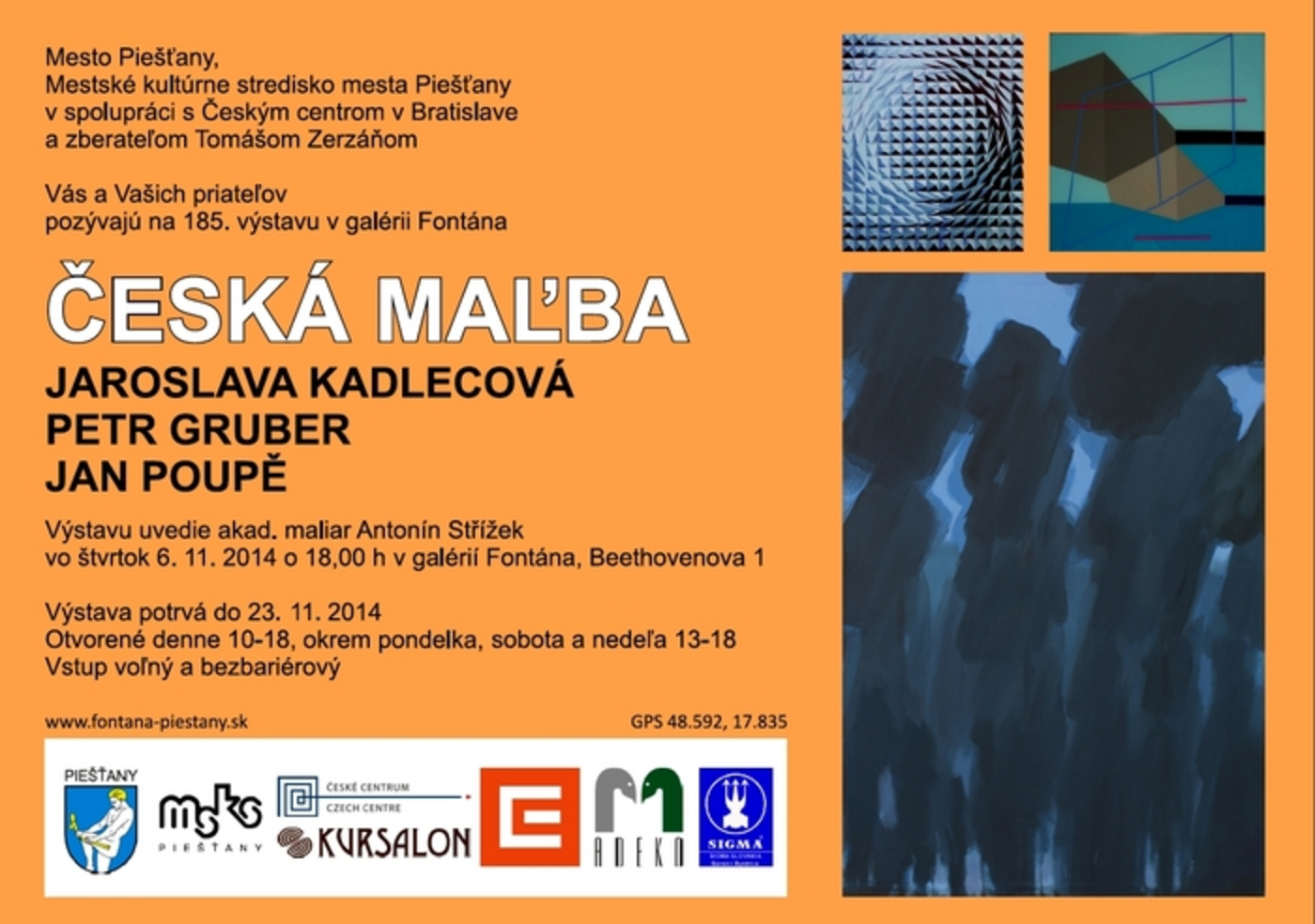 Vernisáž výstavy 3 českých výtvarníkov (Jaroslava Kadlecová, Petr Gruber, Jan Poupě) v spolupráci s Českým centrom v Bratislave a zberateľom Tomášom Zerzáňom.