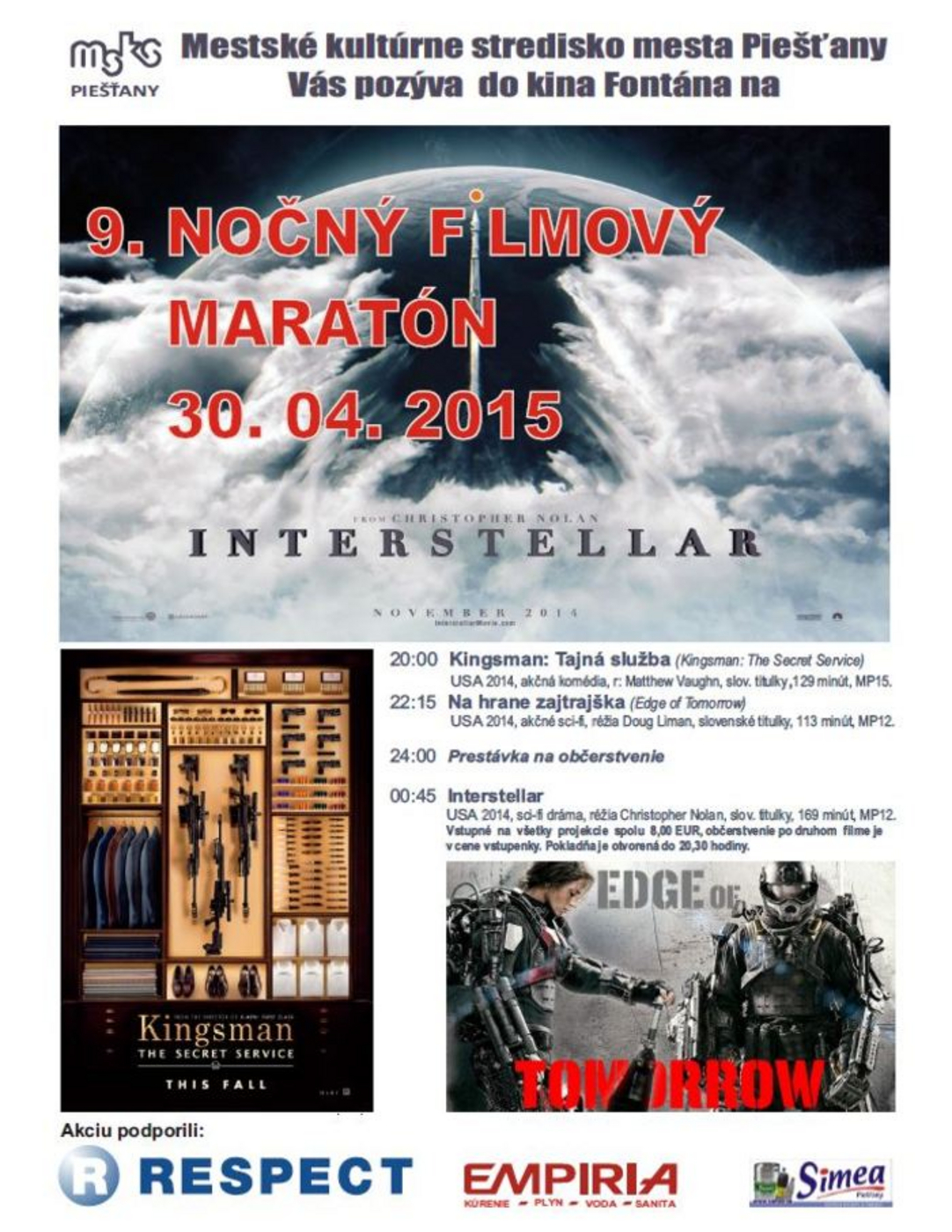Deviaty ročník malej prehliadky troch filmov pre filmových vytrvalcov (20.00 h - Kingsman: Tajná služba; 22.15 h - Na hrane zajtrajška; 24.00 - 00.45 h - prestávka s občerstvením; 00.45 h - Interstellar). Vstupné na všetky tri predstavenia spolu 8,- EUR, po skončení druhého filmu bude prestávka na občerstvenie, ktoré je v cene vstupného. Pokladňa je otvorená do 20.30 h.