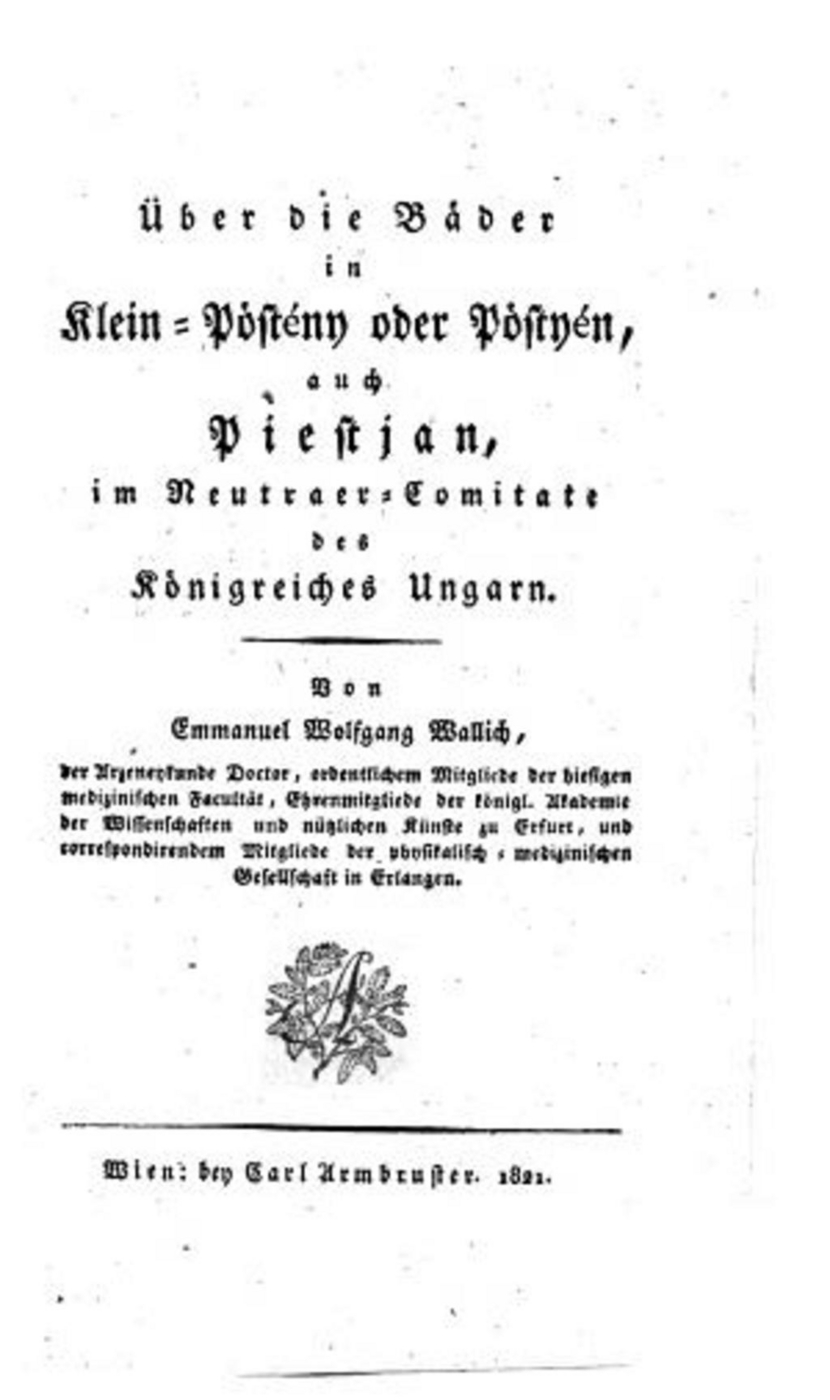 Osobitne katastrofálna povodeň zastihla Piešťany a ich okolie v auguste 1813, keď stúpla hladina Váhu o 14 stôp - asi 4,4 m nad normálny stav. Pri Piešťanoch sa Váh valil v šírke 8 km, poškodil alebo odplavil 355 domov a veľa ľudí sa utopilo. Podrobný opis Piešťan a ich okolia po povodni a pred ich ďalšou rekonštrukciou a výstavbou zanechal doktor lekárskych vied, profesor viedenskej univerzity Emanuel Wolfgang Wallich. Ako pacient navštívil Piešťany v rokoch 1818 a 1820 a roku 1821 vydal monografiu "Űber die Bäder in Piestjan" (O kúpeľoch v Piešťanoch) vo Viedni na 132 stranách. Po krátkom historickom prehľade v nej opísal vlastnosti termálnej vody a bahna, vlastné skúsenosti s liečbou svojej choroby a obšírne rozviedol účinky kúpeľnej liečby pri jednotlivých ochoreniach u svojich spolupacientov. Informoval o možnostiach cestovať z Viedne do Piešťan, o ubytovaní, stravovaní, procedúrach a ich cenách, ako aj o výletoch do okolia. Svojou monografiou chcel oboznámiť viedenských kolegov a širšiu verejnosť s piešťanskými kúpeľmi a tak prispieť k ich popularite.