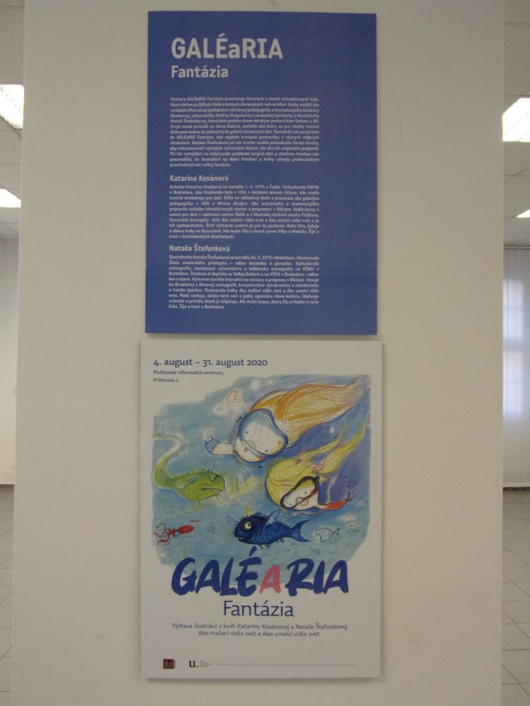 Výstava GALÉRIA Fantázia prezentuje ilustrácie z dvoch interaktívnych kníh, ktoré deťom približujú diela známych slovenských výtvarníkov. Knihy vznikli ako výsledok dlhoročnej spolupráce výtvarnej pedagogičky a dramaturgičky Kataríny Kosánovej, spisovateľky Andrey Gregušovej a umeleckej šperkárky a ilustrátorky Nataši Štefunkovej, ktorá dala podobu dvom detským postavičkám Galému a Rii. Svoje mená prevzali zo slova Galéria, pretože obe knihy sú pre všetky tvorivé duše pozvánkou do jedinečných galérií výtvarných diel. Tentokrát vás pozývame do GALÉRIE Fantázie, kde nájdete kreslené postavičky v rôznych vtipných situáciách. Nataša Štefunková pri ich tvorbe zvolila jednoduchú formu kresby, aby nekonkurovali vybratým výtvarným dielam, ale aby ich originalitu podporili. Pri ich vymýšľaní sa inšpirovala podobami svojich detí a vlastnou tvorbou nás presvedčila, že ilustrátori sú dobrí kresliari a knihy oživujú predovšetkým prostredníctvom veľkej fantázie.