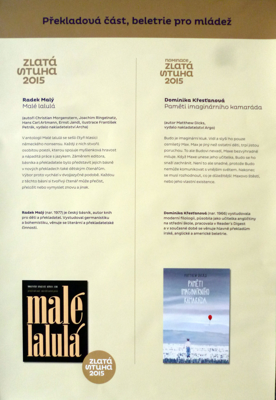 3. Prekladová časť: beletria pre deti, beletria pre mládež, literatúra faktu pre deti a mládež, komiks pre deti a mládež