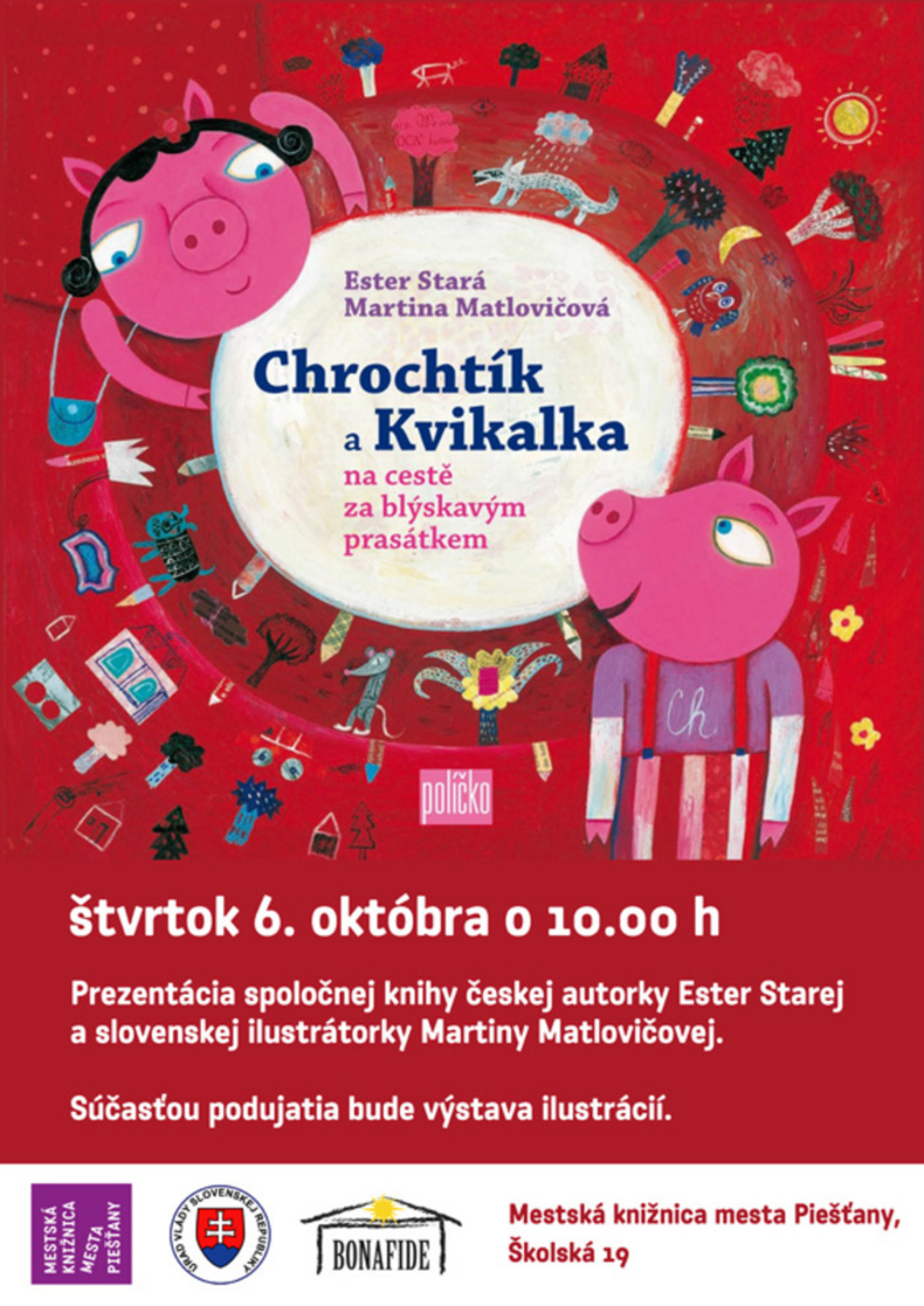 Prezentácia spoločnej knihy českej autorky Ester Starej a slovenskej ilustrátorky Martiny Matlovičovej, ocenenej Zlatou stuhou 2013 za literárnu aj výtvarnú časť. Súčasťou podujatia bude výstava ilustrácií.