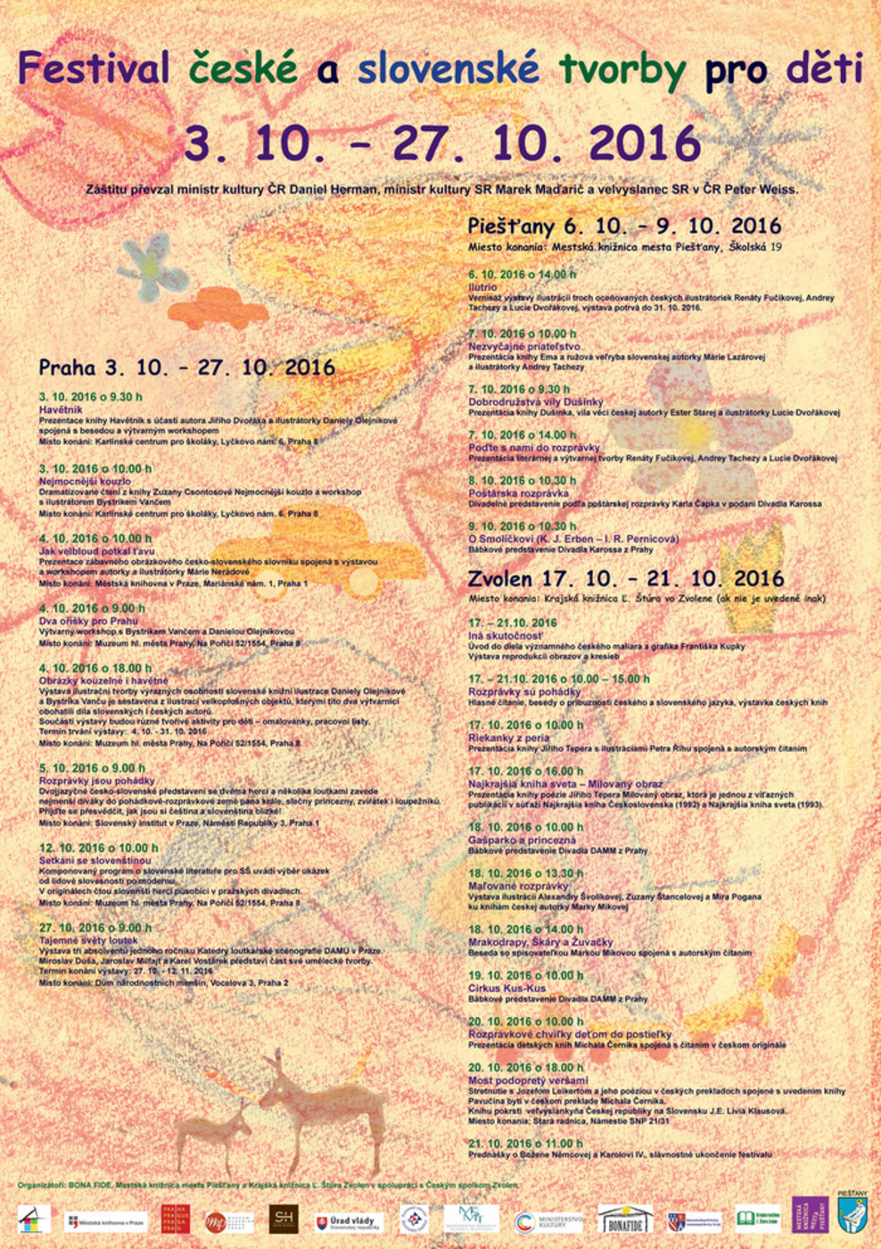 Mestská knižnica mesta Piešťany v spolupráci s neziskovou organizáciou BONA FIDE pripravila ďalší ročník Festivalu českej a slovenskej tvorby pre deti, ktorý je súčasťou Mesiaca českej a slovenskej kultúrnej vzájomnosti. Druhý ročník festivalu bude prebiehať paralelne v Prahe a v Piešťanoch v dňoch 3. 10. - 27. 10. 2016. Festival predstavuje českú i slovenskú literatúru pre deti, prináša workshopy s výtvarníkmi, bábkové divadlá i výstavy ilustrácií, poukazuje na príbuznosť a vzájomnú prepojenosť Čechov a Slovákov. Najmladšej generácii pripomenie blízkosť oboch jazykov i národov, ktoré spája spoločná história, kultúra i tradície. Projekt predstavuje na Slovensku českú tvorbu pre deti a do Českej republiky prináša tvorbu autorov a ilustrátorov zo Slovenska.