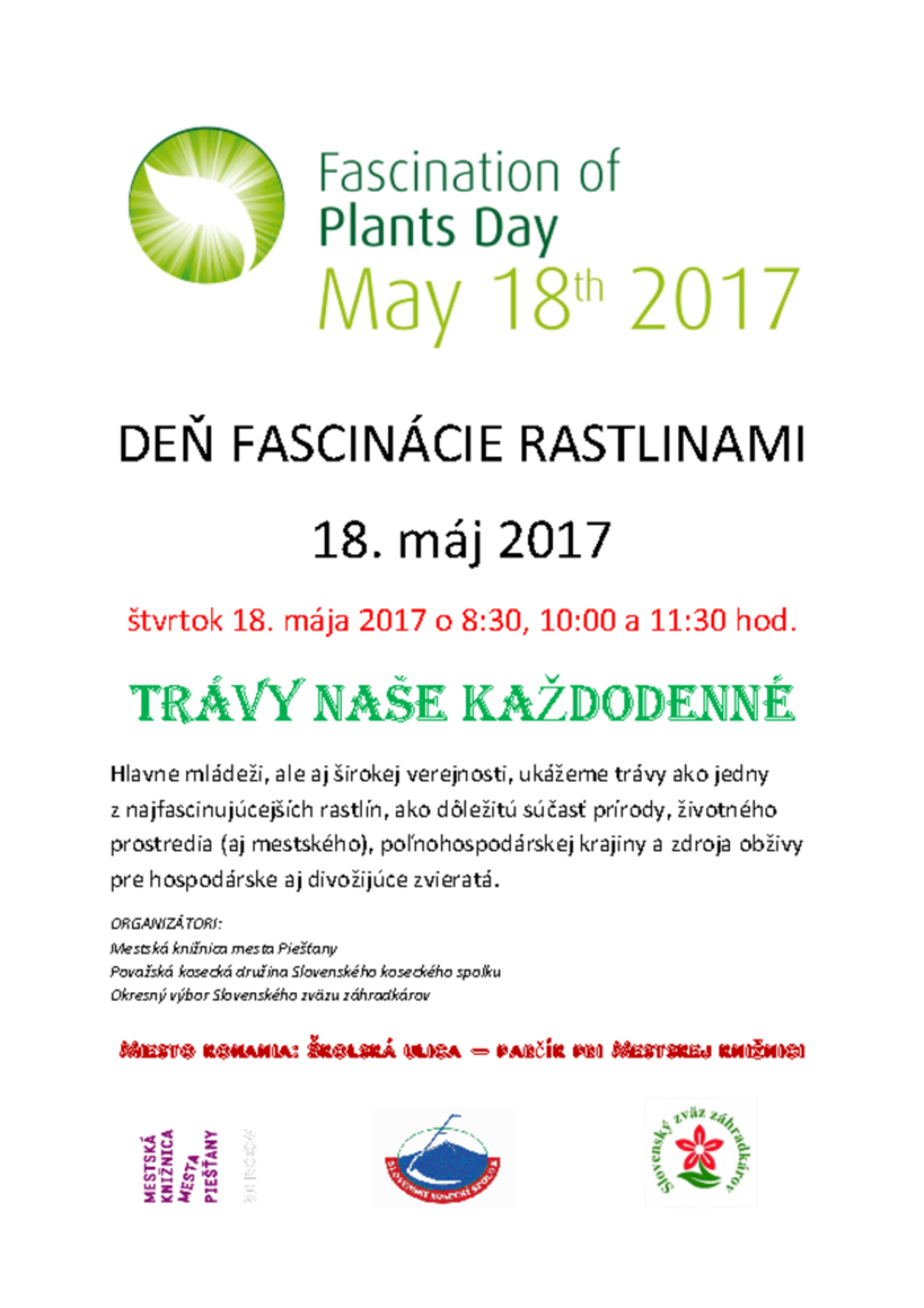 18. 05. 2017 o 08.30 h Mestská knižnica mesta Piešťany (parčík pri Mestskej knižnici)