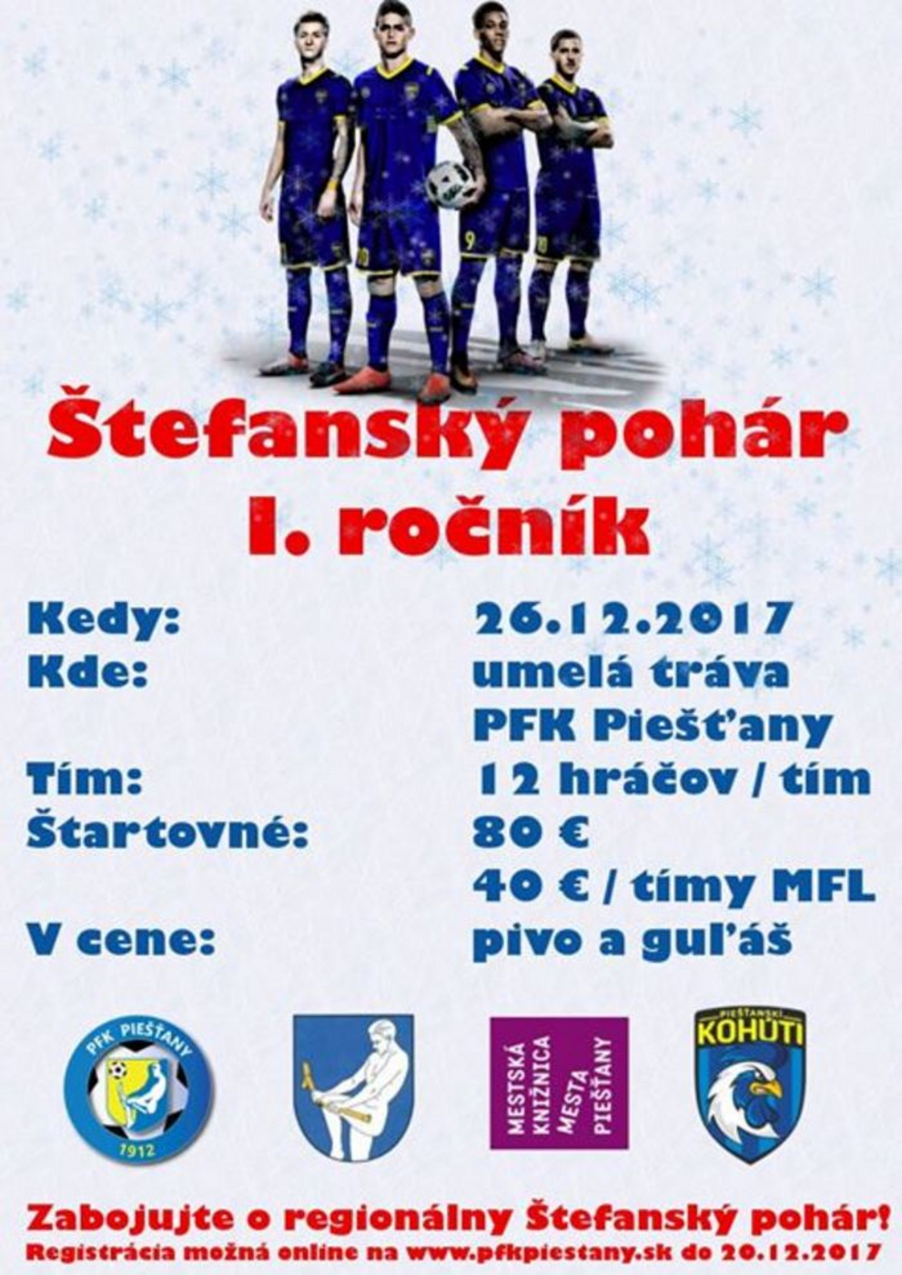 Pre všetkých, ktorí sa chcú počas Vianoc aj trochu hýbať je tu amatérsky futbalový turnaj Štefanský pohár. Zoberte partiu a poďte sa vybehať. Veková hranica neexistuje (samozrejme, hráčom, ktorí majú menej ako 18, bude v cene podávaný nealkoholický nápoj).