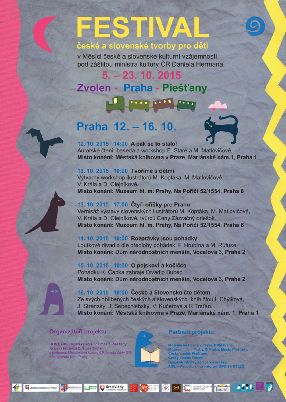 Pri príležitosti Mesiaca českej a slovenskej vzájomnosti sa Mestská knižnica mesta Piešťany zapája do medzinárodného česko-slovenského projektu, ktorý sa uskutoční v dňoch 12. – 24.10. 2015 pod záštitou ministra kultúry ČR Daniela Hermana. Poslaním Festivalu českej a slovenskej tvorby pre deti je priniesť českú a slovenskú literatúru, rozprávkové knihy a workshopy, bábkové predstavenia, výstavu ilustrácií, poukázať na príbuznosť Čechov a Slovákov, na blízkosť oboch jazykov i národov, ktoré spája časť spoločnej histórie, kultúry i tradícií. Hlavným organizátorom podujatia je nezisková organizácia BONA FIDE Praha.