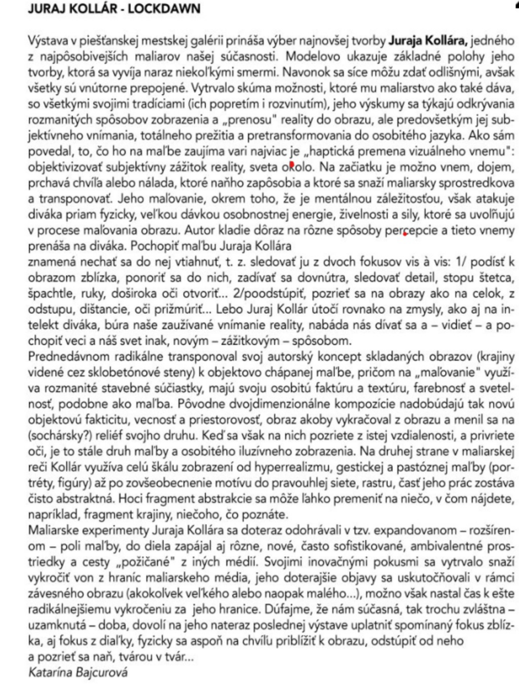 Výstava Lockdawn v Piešťanskej mestskej galérii priniesla výber najnovšej tvorby Juraja Kollára, jedného z najpôsobivejších maliarov našej súčasnosti. Modelovo ukázala základné polohy jeho tvorby, ktorá sa vyvíja naraz niekoľkými smermi. Vzhľadom k tomu, že táto výstava bolo verejnosti kvôli pandemickým opatreniam prístupná len niekoľko dní, presunulo ju Mestské kultúrne stredisko mesta Piešťany do virtuálneho priestoru. Od 20.apríla 2021 bola výstava opäť sprístupnená verejnosti s pravidelnými komentovanými prehliadkami, ktoré viedla dramaturgicko-výchovná pracovníčka MsKS Linda Blahová. Juraj Kollár (nar. 1981 v Nitre) študoval na Vysokej škole výtvarných umení v Bratislave (prof. Daniel Fischer, 1999 – 2003) a na Akadémii výtvarných umení v Prahe (prof. Zdeněk Beran, 2003 – 2005). Získal viacero domácich i medzinárodných ocenení (Cena Igora Kalného, Zlín, 2009; Celeste Prize, 3. cena, Berlín, 2009; VÚB Maľba roka, Bratislava, 2010). Mal viacero samostatných výstav. Jeho práce sú zastúpené vo verejných a súkromných zbierkach doma i v zahraničí, v Slovenskej národnej galérii, v Galérii mesta Bratislavy, v Národnej galérii v Prahe atď. Dlhší čas žil a maľoval v Paríži, v súčasnosti žije a tvorí v Bratislave. V roku 2020 mu vyšla knižná monografia Square One s úvodnou štúdiou Kataríny Bajcurovej a rozhovorom, ktorý viedla Eva Skopalová, autorom grafického dizajnu je Jan Šiller. Virtuálna verzia výstavy LOCKDAWN zostane natrvalo prístupná prostredníctvom web stránky Mestského kultúrneho strediska Piešťany, ktoré nechalo z 360-stupňových fotografií vytvoriť prezentáciu. Tú môže každý vidieť kdekoľvek a kedykoľvek.